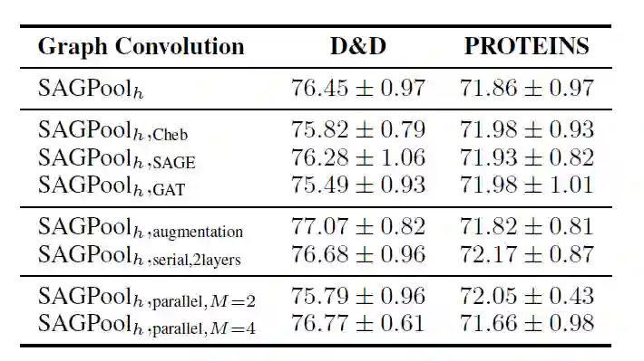 同时文中还比较了上文提到的三种使用最广泛的GCN(SAGPoolCheb,SAGPoolSAGE,SAGPoolGAT)的性能,以及上文提到的肌酸注意力分数的SAGPool的三个变体的性能,结果如下所示: