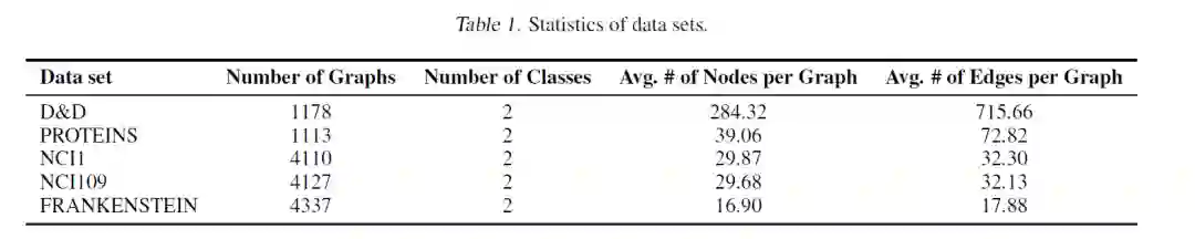 文中从基准数据集中选择了五个具有大量图形(> 1k)的数据集,并在训练数据中选择10%作为验证。表1汇总了数据集的统计信息。