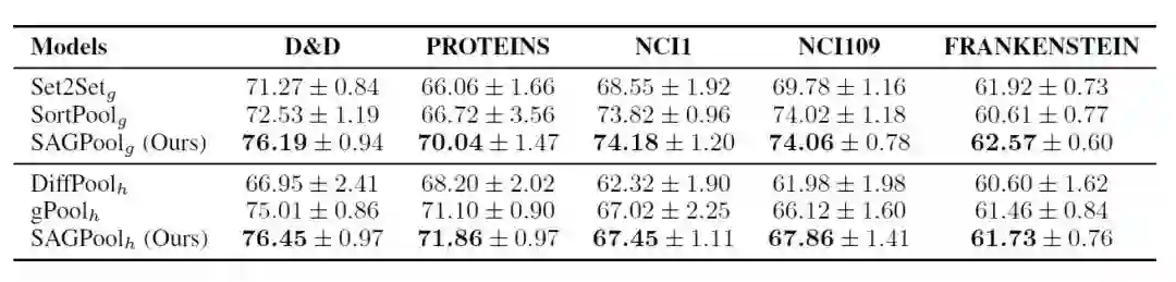 为了对比SAGPool与以往的模型的效果,文中使用了Set2Set, SortPool作为全局池化框架的baseline,同时使用DiffPool与gPool作为分层池化框架的baseline,对比结果如下所示: