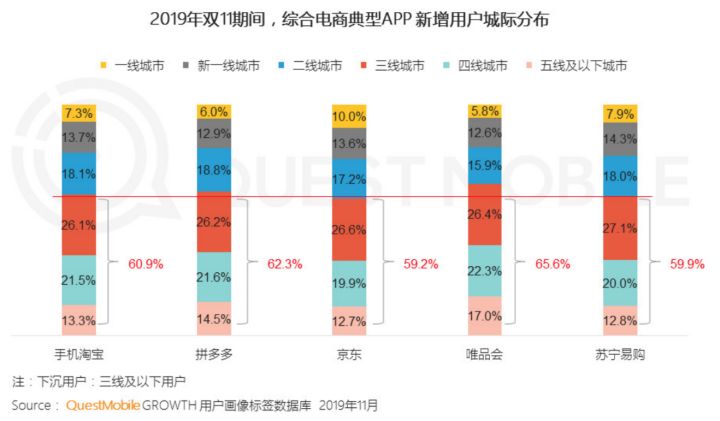 引人注目的是,双十一期间,手机淘宝、拼多多和京东三家新增用户中有六成都来自三线及以下市场。