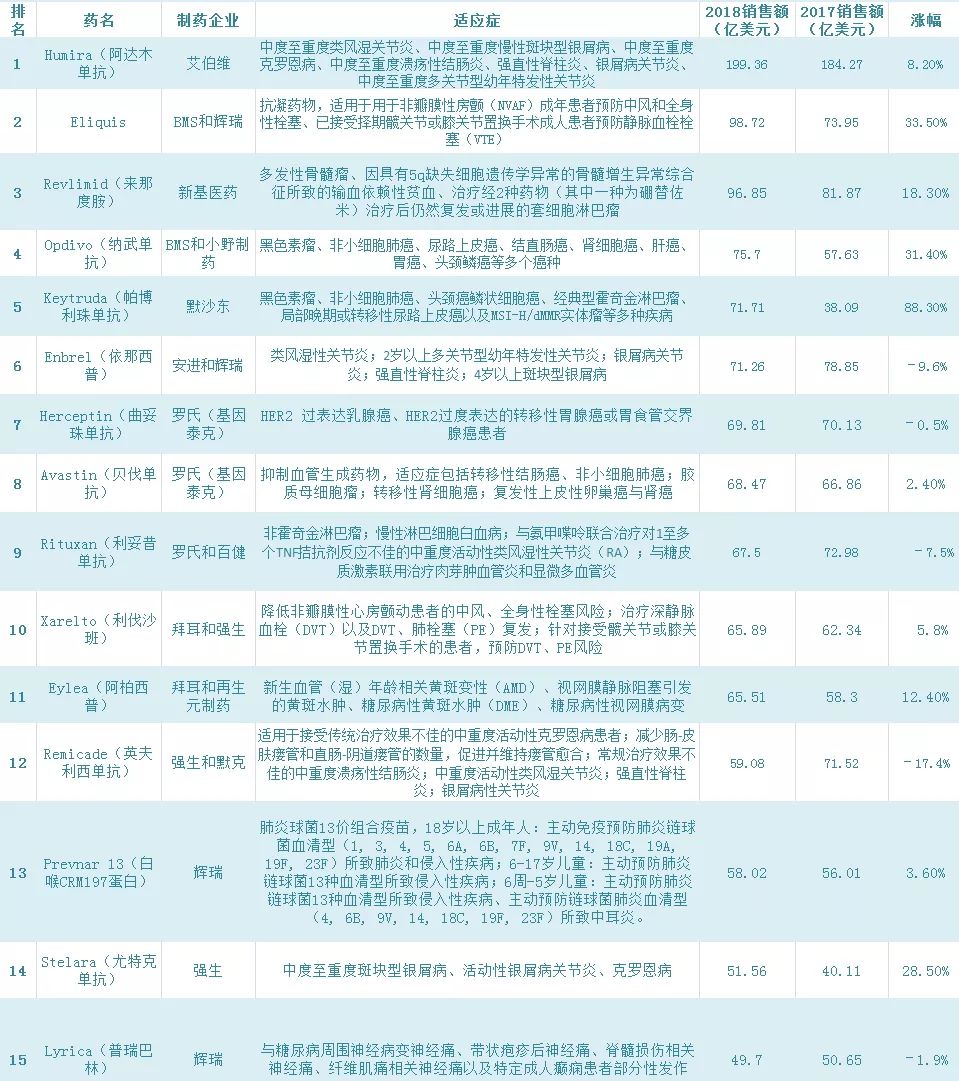 位居榜首的依然是“常胜军”Humira(修美乐),其次是抗凝药物Eliquis。值得注意的是,15款药物中有6款药物适用于癌症治疗,包括两款热门的PD-1药物Keytruda和Opdivo。
