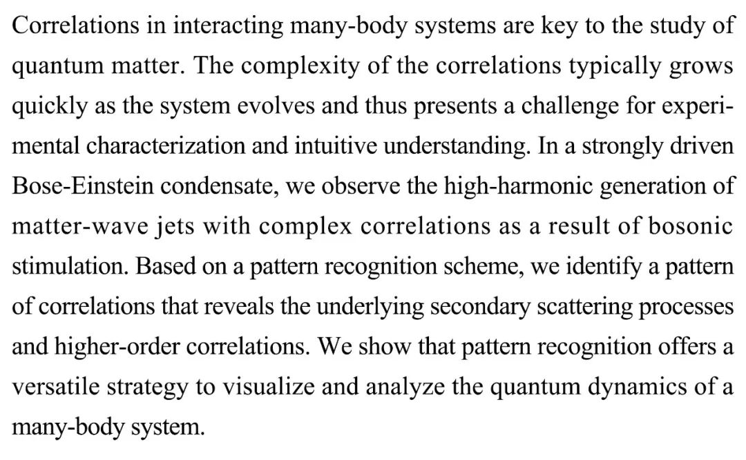 (导读 刘奇)多体系统中的交互相关性是研究量子物质的关键,但其复杂性会快速增加不利于实验表征和直观理解。本研究在强驱动Bose-Einstein凝聚体中观察到玻色子激发产生的具有复杂相关性的物质波射流的高次谐波。通过模式识别方法研究人员揭示了潜在的二次散射过程和高阶相关性。研究结果表明模式识别可以为多体系统的量子动力学分析提供一种通用策略。