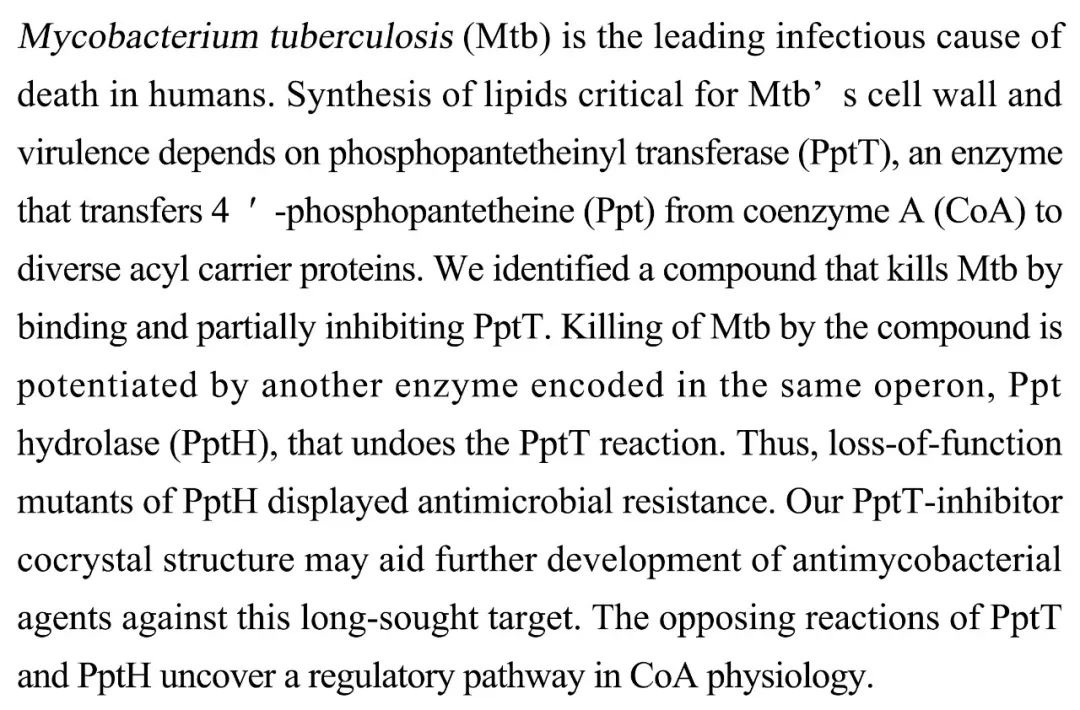 (导读 郭思瑶)结核分枝杆菌是造成人类感染死亡的重要原因。其细胞壁和毒力因子的合成依赖于磷酸泛酰巯基乙胺基转移酶(PptT)。科研人员发现一种成分可以通过结合并抑制PptT来杀死结核分枝杆菌。该杀菌效应可被磷酸泛酰巯基乙胺基水解酶(PptH)增强,而PptH缺失导致抗性。这对于抗结核新型药物的研发有重要启示。