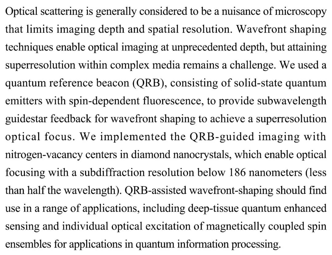 (导读 阿金)光学散射会限制成像深度和空间分辨率,而波前成型技术使得光学成像达到前所未有的深度,但在复杂介质内获得超高分辨率仍是挑战。本研究在金刚石纳米晶体的氮空位缺陷中心,使用量子参考信标(QRB)实现了小于186纳米的超高分辨率光学聚焦成像。该技术有望在多个领域获得广泛应用,例如深层人体组织成像和量子信息等。