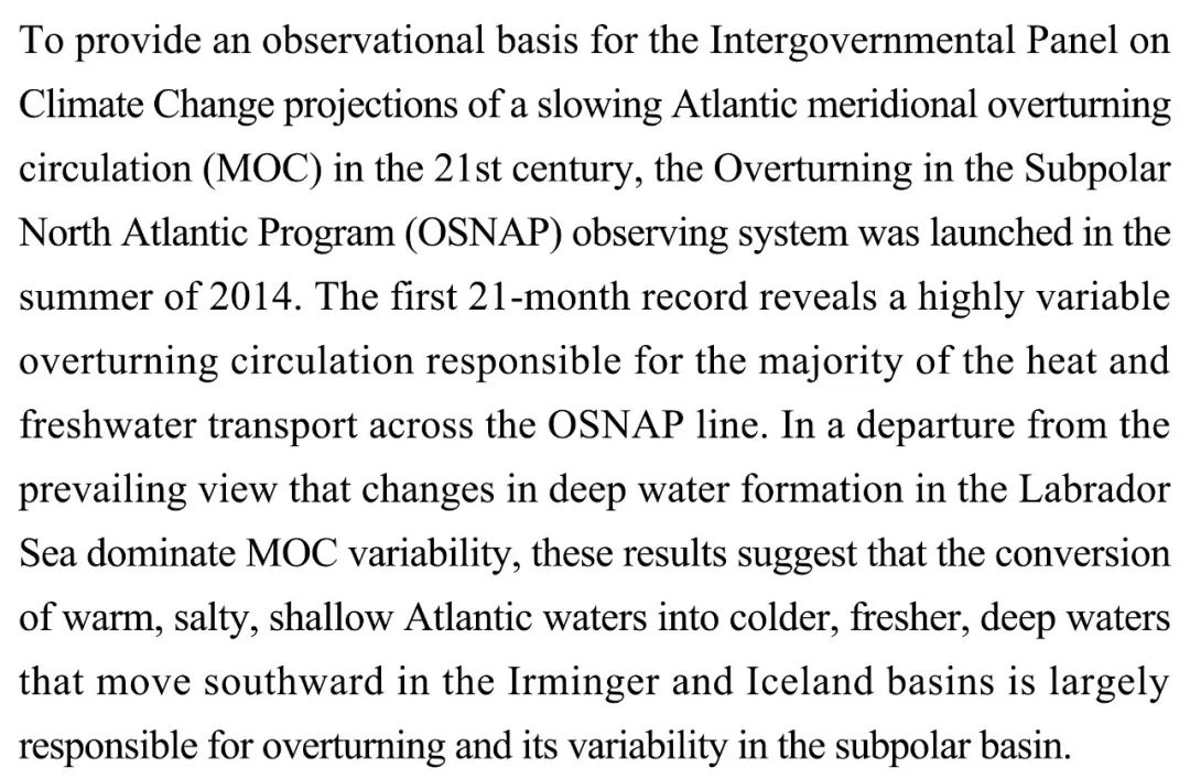 (导读 阿金)2014年夏季启动了北大西洋亚极地翻转环流项目(OSNAP)观测系统,最初21个月的纪录显示对热量与淡水跨OSNAP线输送的高度变化的翻转环流响应。研究结果表明大西洋浅层温暖咸海水注入向南流入伊尔名厄和冰岛盆地的更冷深层淡水中,是造成亚极地盆地翻转环流及其变化的主要原因。