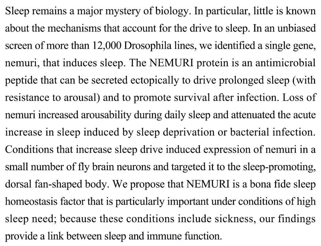 (导读 王思菲)驱动睡眠的机制仍有诸多未知。本研究通过无偏见筛选12000个果蝇株系发现nemuri基因可驱动睡眠。NEMURI作为异位分泌的抗菌肽可抵抗唤醒并延长睡眠,并促进感染后存活。Nemuri缺失增加日常睡眠中唤醒且减少因睡眠剥夺或细菌感染增加的睡眠急性需求。增加睡眠的条件下,nemuri在果蝇大脑中促眠背部扇形体神经元表达量增加。提示NEMURI是一种维持睡眠稳态因子,为睡眠和免疫功能建立联系。