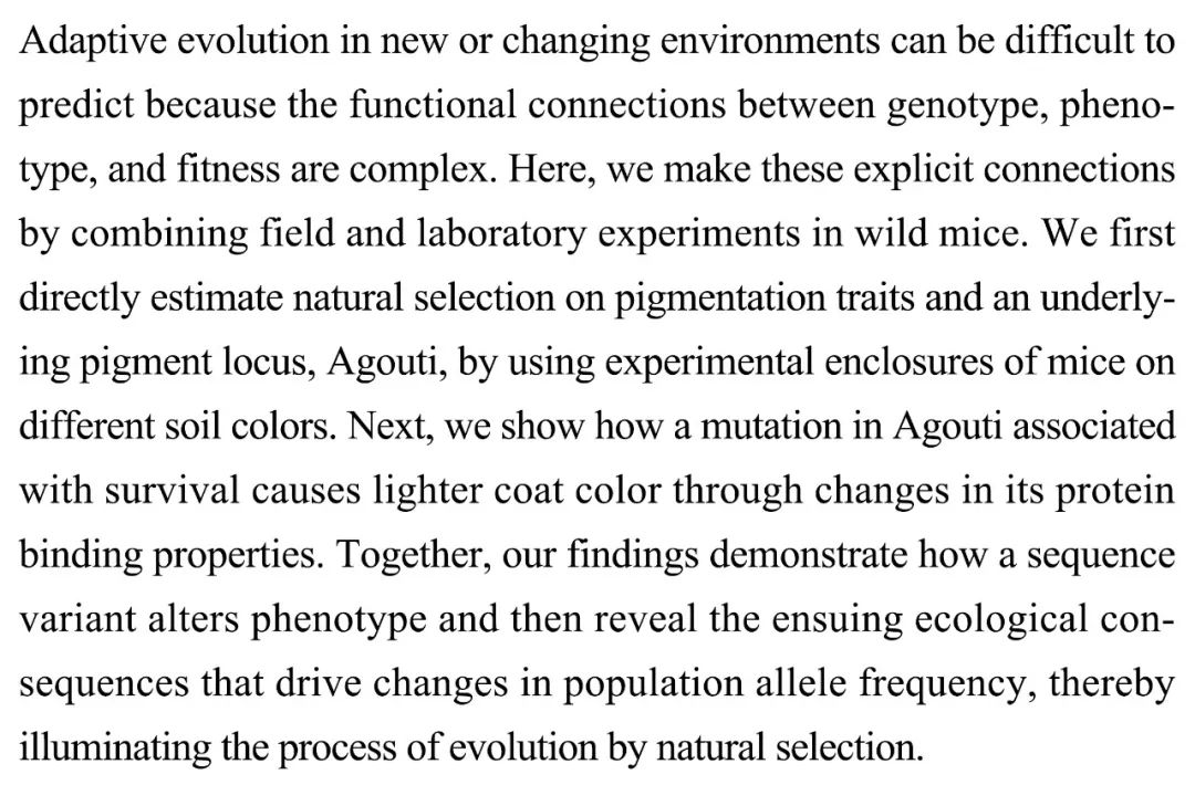 (导读 郭思瑶)由于表型,基因型,适应性之间的关系复杂,新环境中的适应性演化难以被预测。科研人员通过对野生型小鼠进行田间与实验室实验,利用不同土壤颜色直接估计色素性状及相关基因座Agouti的自然选择,并证明了Agouti上的生存相关突变如何通过改变蛋白质结合特性进而使毛色变浅。这说明了序列变化如何改变表型,进而导致驱动种群等位基因频率改变的生态后果,通过自然选择阐明了演化进程。