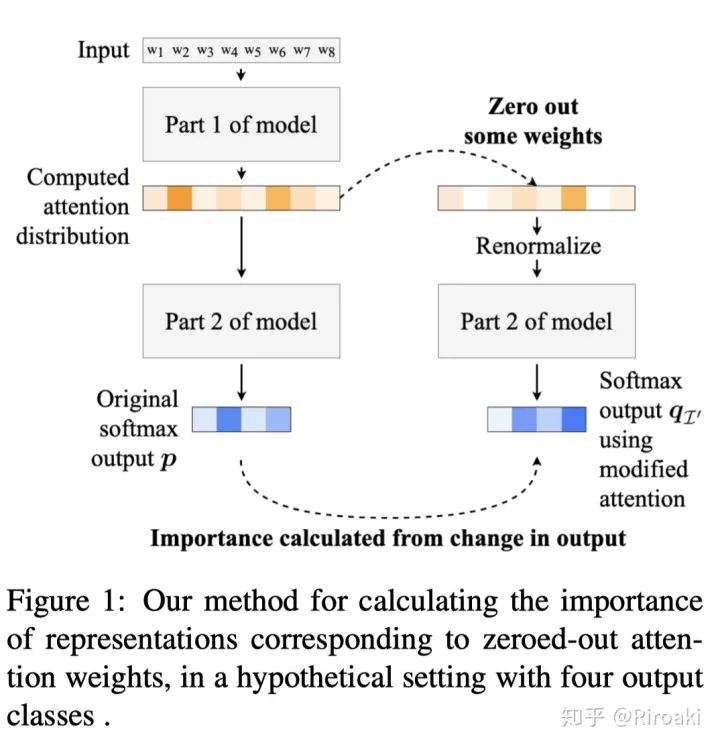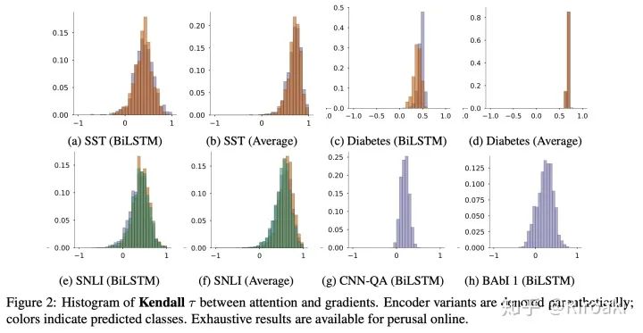 1,Jain和Wallace(2019)的论文《Attention is not Explanation》将注意力权重的分布和基于特征的显著性度量分布进行比较,并且做了将句子输入进行扰动然后对注意力权重做对抗性搜索,得出结论: