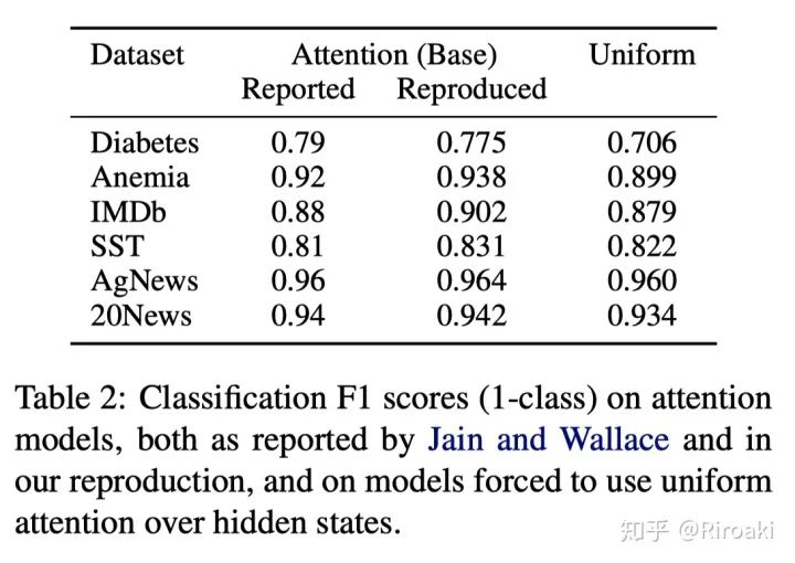 如果使用统一权重,NMT 模型的性能会显著降低,而随机注意权重对文本分类性能的影响最小。因此,文本分类研究的结果可能不会概括为注意力是关键组成部分的任务。