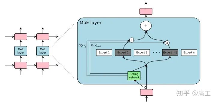 嵌入在循环(recurrent)语言模型中的专家混合 (Mixture of Experts,MoE) 层。在这种情况下,稀疏门控函数选择两个专家来执行计算。它们的输出由门控网络的输出调制。
