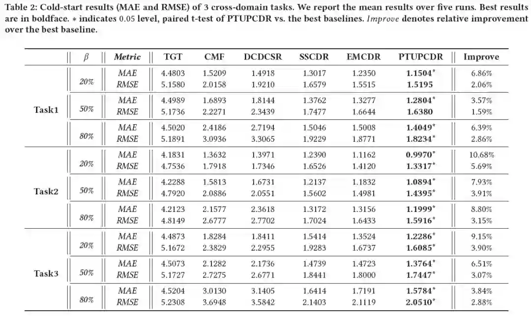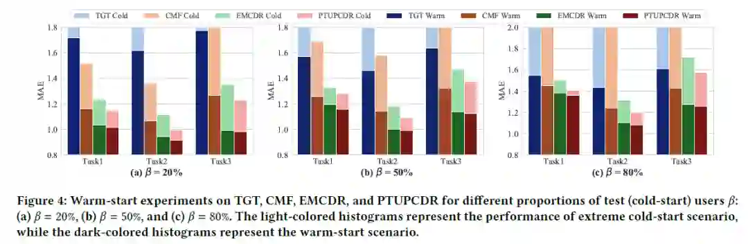 此外我们还做了warm start实验,也就是基于这个映射得到向量表示作为初始化,使用后续交互数据微调,得到以下结果,可以看到,针对warm start场景,我们的方法也是很有效的,这也是第一篇同时验证跨领域推荐方法在cold-start和warm-start场景的文章。