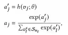 整体框架如上所示,主要包含两个部分,特质编码器,元网络。具体来讲,特征编码器使用一种注意力机制,将用户在源领域交互过的所有item聚合起来,表示用户在源领域的特质: