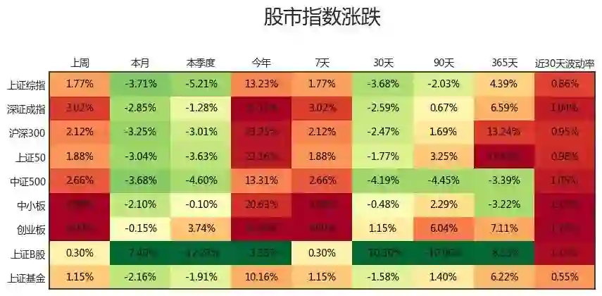 上周各指数均缩量反弹,其中中小创周度表现相对最好,上涨4%,上证指数和上证50表现最差,仅涨1.77%和1.88%;