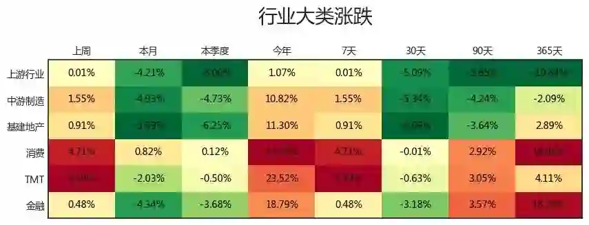 从行业来看,上周各行业均上涨,但主要是消费行业和TMT行业涨幅较大,涨幅分别为 4.71%和5.39%,其余行业涨幅在1.5%以内。