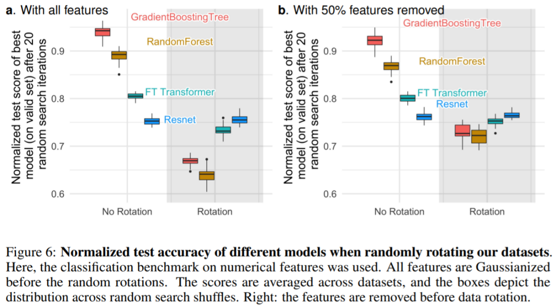 图 6b 中显示:删除每个数据集中最不重要的一半特征(在旋转之前),会降低除 Resnets 之外的所有模型的性能,但与没有删除特征使用所有特征时相比,相比较而言,下降的幅度较小。