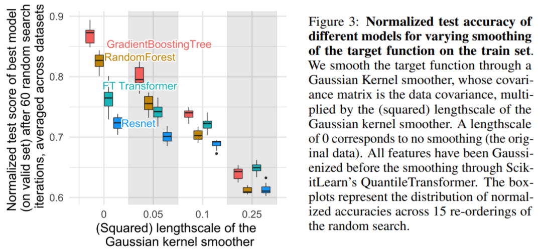 如图 3 所示,对于较小的尺度,平滑训练集上的目标函数会显着降低基于树的模型的准确率,但几乎不会影响 NN。这些结果表明,数据集中的目标函数并不平滑,与基于树的模型相比,NN 难以适应这些不规则函数。这与 Rahaman 等人的发现一致,他们发现 NN 偏向于低频函数。基于决策树的模型学习分段(piece-wise)常函数,没有这样的偏置。