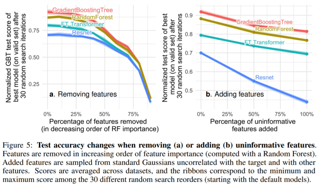 图 5 可以看到移除非信息特征 (5a) 减少了 MLP (Resnet) 与其他模型(FT Transformers 和基于树的模型)之间的性能差距 ,而添加非信息特征会扩大差距,这表明 MLP 对非信息特征的鲁棒性较差。在图 5a 中,当研究者移除更大比例的特征时,相应的也会删除有用信息特征。图 5b 表明,去除这些特征所带来的准确率下降可以通过去除非信息特征来补偿,与其他模型相比,这对 MLP 更有帮助(同时,该研究还删除了冗余特性,也不会影响模型性能)。