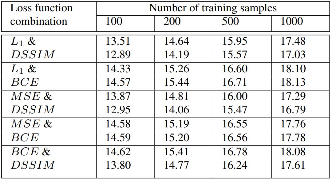 表 3:使用不同的损失函数组合时产生的每个重建结果的 PSNR 值。我们在这里用了两个解码器网络模型,每个解码器都有一个损失函数。对每一个损失函数组合来说,第一行的 PSNR 值对应第一个重建损失函数(用在第一个解码器中),第二行对应的是第二个损失函数(用在第二个解码器中)。
