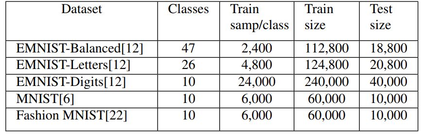 我们只用每类 200 个训练样本的数据进行训练,就得到了超越基于 EMNIST-letter 数据集所获的现有字符识别的结果,同时还获得了与 EMNIST-balanced 、EMNIST-digits 以及 MNIST 这三个数据集相当的现有结果。