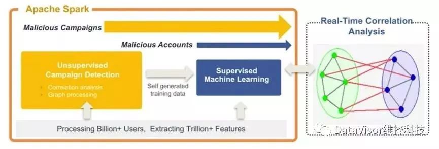 无监督学习算法无需依赖任何标签数据来训练模型,这种算法的核心内容是无监督欺诈行为检测,通过利用关联分析和相似性分析,发现欺诈用户行为间的联系(图片来源:DataVisor公众号)