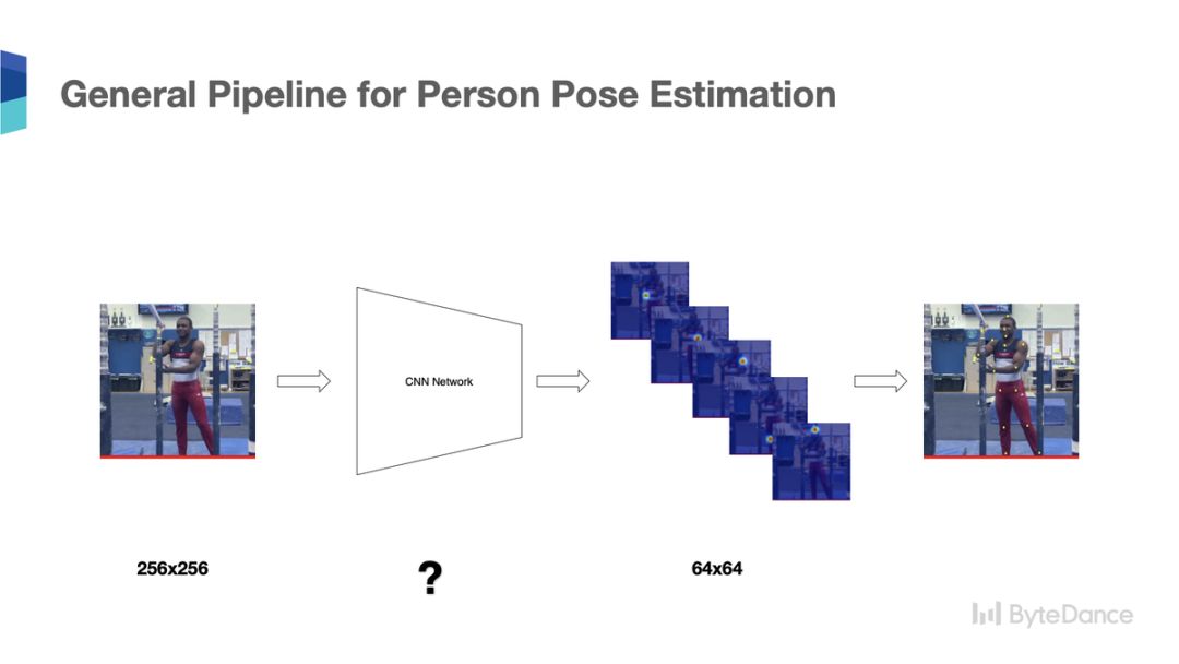 通用的单人体姿态识别的框架通常为:给定单人图片作为输入,通过 CNN(Convolutional Neural Network)得到高分辨率的人体关键带的热点图片,最后通过在热点图片中寻找最大极值点,得到人体关键点坐标。