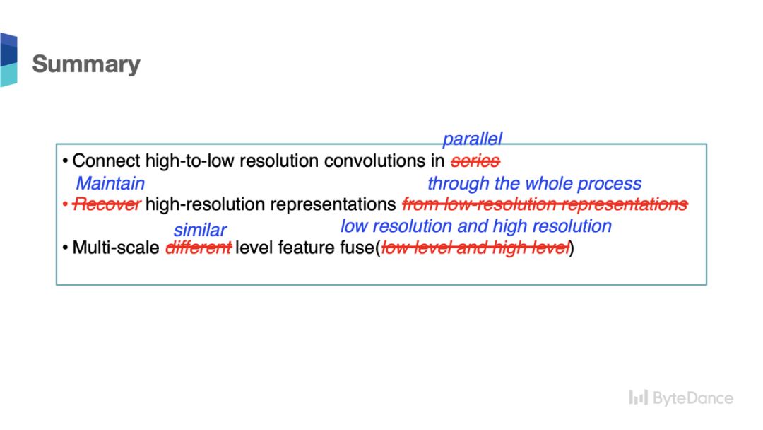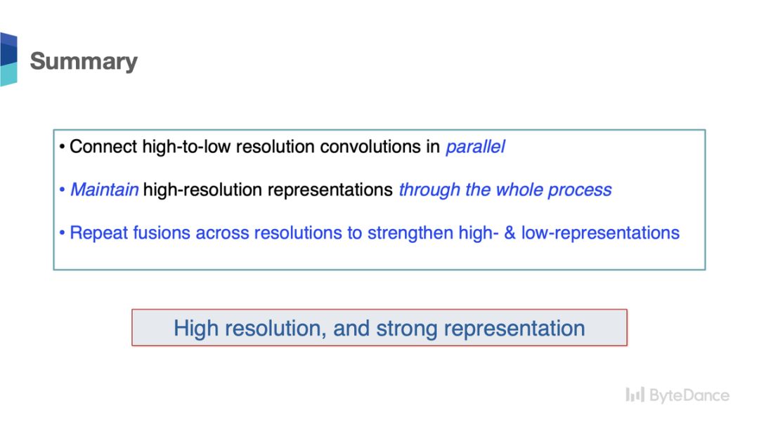 首先,HRNet 的高分辨率特征和低分辨率特征是并行连接。其次,HRNet 始终会学习一个高分辨率的特征表达。最后,HRNet 是通过多次的高分辨率特征和低分辨率特征的交换,来进一步增强高分辨率特征的学习。通过这种方式,HRNet 可以学到更强的高分辨率的特征表达。