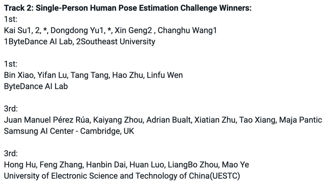 今年的 LIP 国际竞赛上,字节跳动人工智能实验室拿下了两个国际冠军和一个国际亚军。由字节跳动和东南大学组成的团队、以及肖斌带领的字节跳动团队并列单人人体姿态估计比赛的国际冠军;同时,字节跳动和东南大学组成的团队同时还获得了单人人体分割赛道的国际亚军。