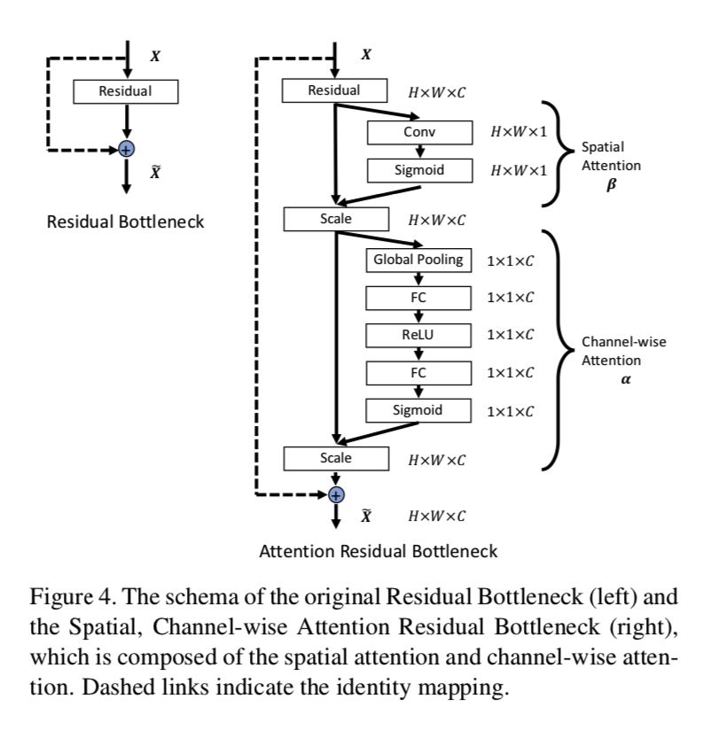 其次,特征融合的过程是动态多变的,融合后的特征往往也存在许多冗余。网络中那些对姿态估计任务更加有效的特征信息应该被自适应地突显出来。因此,论文提出基于空间和通道注意力机制的残差模块,自适应地从空间和通道两个维度增强刚刚融合后的金字塔特征信息。
