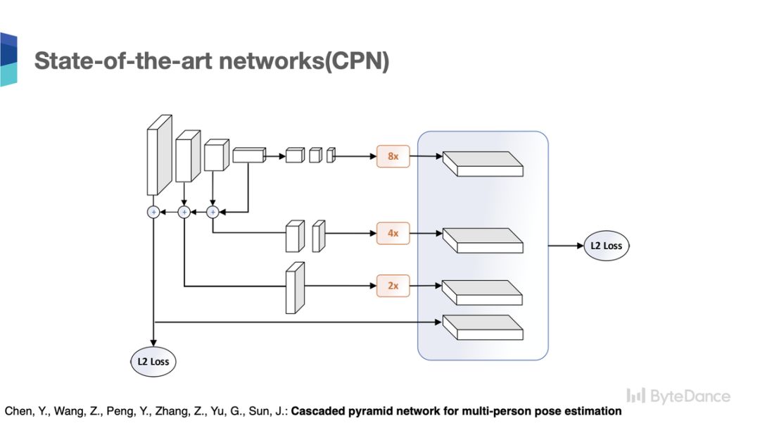 在 2018 年,COCO 人体关键点比赛中,旷视团队提出了 CPN 网络(Cascaded Pyramid Network)[2],获得 COCO 人体姿态识别的冠军。CPN 网络使用 ResNet 作为骨干网路,采用了类似特征金字塔的结构来生成高分辨的人体姿态关键点热点图。CPN 主干网路也是遵循从高分辨率特征到低分辨率特征的串行结构,最后通过跳连结构以及上采样操作,得到最终的高分辨率的热点特征图。