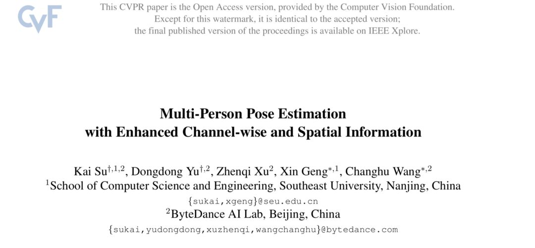 字节跳动和东南大学组成的团队提出了基于增强通道和空间信息的人体姿态估计网络,论文《Multi-Person Pose Estimation with Enhanced Channel-wise and Spatial Information》的一作苏凯是来自东南大学模式识别与挖掘实验室(PALM)硕士生三年级,师从东南大学耿新教授。目前在字节跳动人工智能实验室实习,导师是喻冬东博士(共同一作)和王长虎博士。