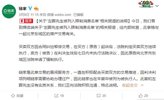 这个话题还是要从左晖入限制消费名单说起。2018年3月5日,北京市东城区人民法院发布一条限制消费令,对北京链家房地产经纪有限公司及实际控制人左晖采取限制消费措施。
