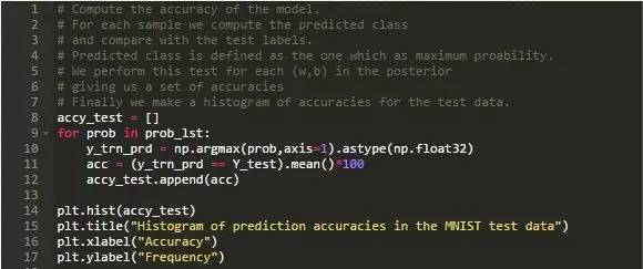 现在我们已经准备好在测试数据上运行模型所需要的一切。贝叶斯模型评估的主要区别在于权重和偏差不存在单一值来评估模型。相应的,我们在模型中使用权重和偏差的分布,以便在最终预测中反映这些参数的不确定性。因此,我们不是单一的预测,而是得到一组预测及其准确率。