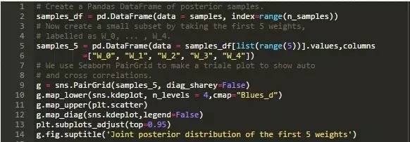 我们还要看一下后验分布。不幸的是,即使是这样的小问题,维度的数量也是相当大的,因此对其进行可视化是非常棘手的!我们选择前5个维度,并产生一个相关性的三角图。