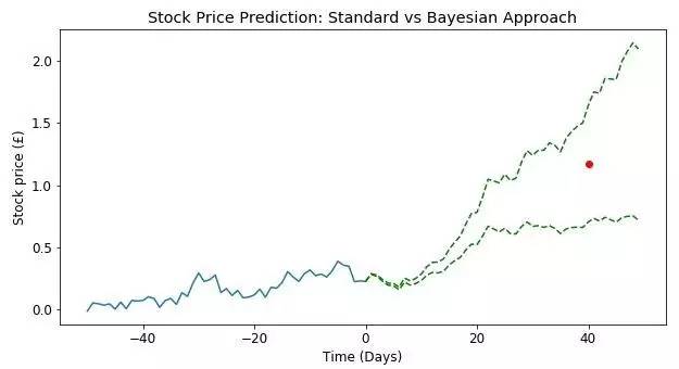 图中显示了在置信度为95%时未来40天内股票价格的点估计(红色圆圈)。由于没有评估不确定性,我们无法判断在交易时将承担多少风险。