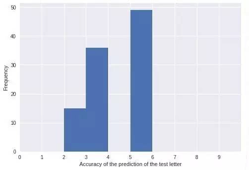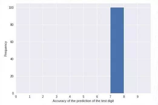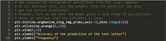 我们获得了一组采样的准确率。注意权重和偏差的后验分布反映了从整个MNIST测试数据获得的信息。因此上述直方图表示来自权重和偏差的统计可能范围的准确率。
