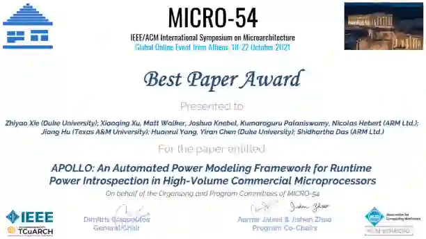 团队的研究论文《可用于大规模商业化处理器的全自动化功耗模拟架构》 (APOLLO: An Automated Power Modeling Framework for Runtime Power Introspection in High-Volume Commercial Microprocessors)获得了2021年MICRO唯一的最佳论文奖。