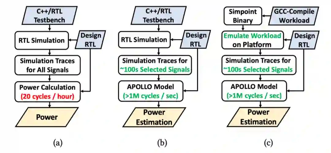 设计时每周期功率分析流程。(a) 商业应用;(b) 基于APOLLO;(c) APOLLO与仿真器辅助相结合