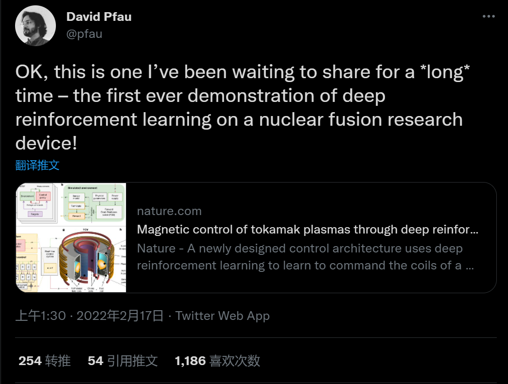 DeepMind研究科学家David Pfau在论文发表后感叹道:「为了分享这个时刻我已经等了很久,这是第一次在核聚变研究设备上进行深度强化学习的演示!」