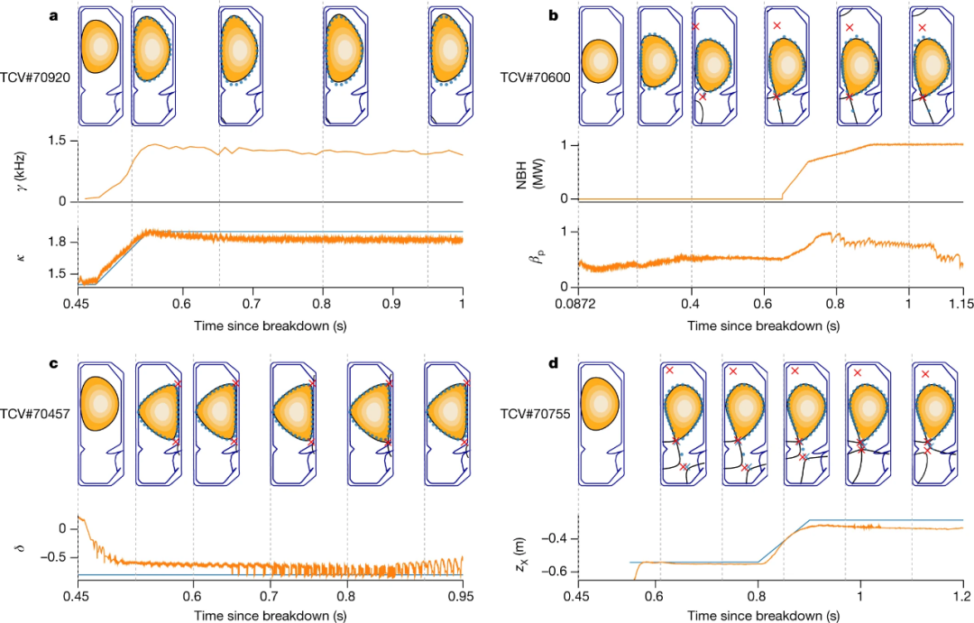 在第三阶段,控制策略与相关的实验控制目标绑定到一个可执行文件中,使用量身定制的编译器(10 kHz 实时控制),最大限度地减少依赖性并消除不必要的计算。这个可执行文件是由托卡马克配置变量(TCV)控制框架加载的(图 1d)。每个实验都从标准的等离子体形成程序(plasma-formation procedures)开始,其中传统控制器维持等离子体的位置和总电流。在预定时间里,称为「handover」,控制切换到控制策略,然后启动 19 个 TCV 控制线圈,将等离子体形状和电流转换为所需的目标。训练完成后将不会进一步调整网络权值,换句话说,从模拟到硬件实现了零样本迁移。