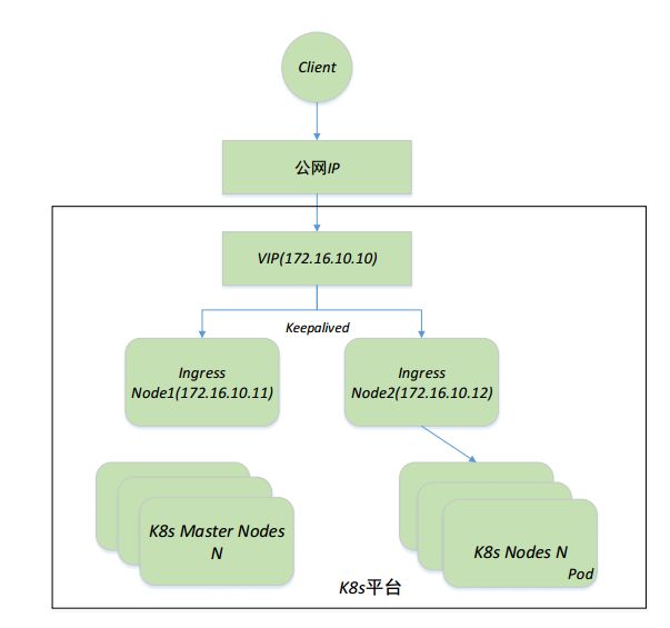 如上图所示,部署两个ingress节点172.16.10.11和172.16.10.12。公网ip映射或转发到内网的VIP地址172.16.10.10上(如果VIP本身是公网IP则可以不用转发)。ingress controller的副本数replicaCount为2,将被调度到node1和node2这两个节点上。同时,使用pod反亲和性禁止ingress pod调度在同一个节点上。