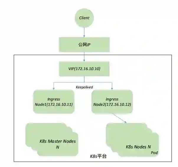 在该架构中,Ingress节点一般使用独立的服务器,即只做将集群外部流量接入到集群内部。除了使用external Ip来暴露ingress的Service到集群外部,还可以使用hostNetwork,如果是公有云,还可以使用LoadBalance。这样Ingress Controller将监听节点的80和443端口,通过热备的形式部署多个ingress节点,并在每个节点上部署Keepalived,多个节点共同维护一个VIP,实现Ingress服务的高可用。