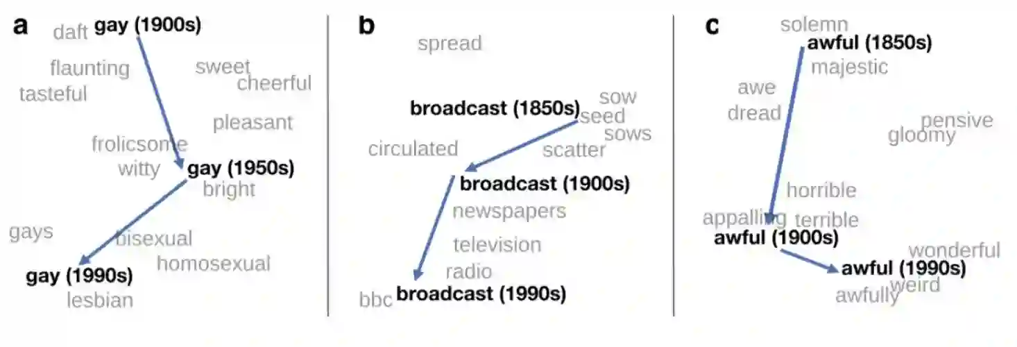言语是时代精神的镜子,它们的含义会随时间而不断变化;当前的词所表达的含义可能与这些词在过去以及未来的含义大不相同。因此,考虑时间维度和词随时间变化的性质是一个有趣的研究方向。这让我们可以揭示出语义变化的规律(Hamilton et al., 2016; Bamler & Mandt, 2017; Dubossarsky et al., 2017)[27, 28, 29]、在时间上建模词类比(word analogy)或相关性(Szymanski, 2017; Rosin et al., 2017)[30, 31] 或获取语义关系的动态规则(Kutuzov et al., 2017)[31]。