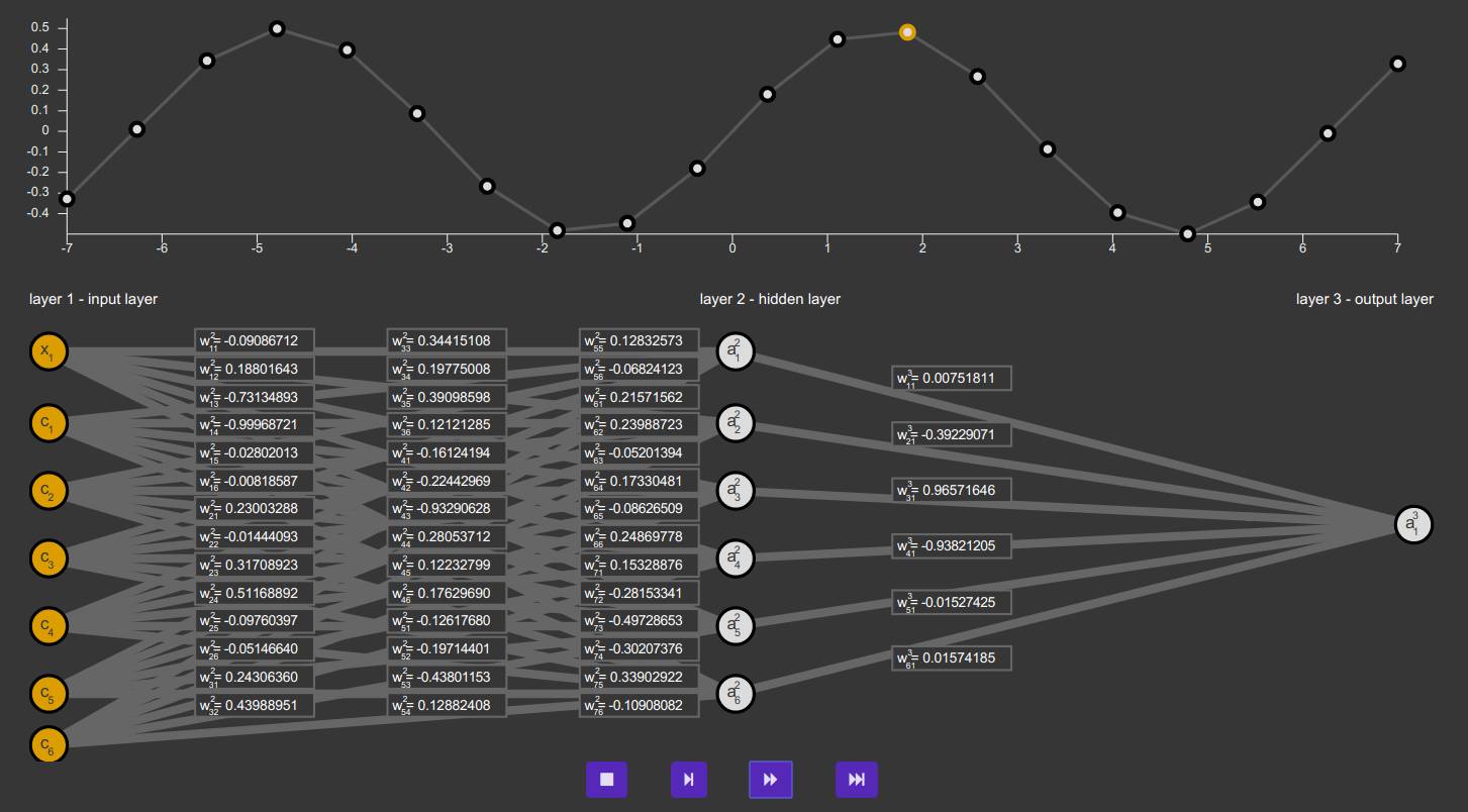 最后分享一个神经网络的可视化网站,网站效果如下图所示,可以点击鼠标观察每一步迭代参数的改变,十分直观。以线性回归器为例,你可以先随意用鼠标在坐标系中初始化一些散点,然后就可以看到线性回归是如何一步步拟合你所画的点了。[3]