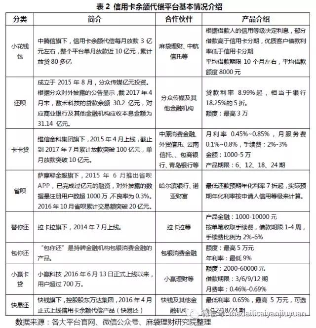 2015年4月维信金科推出卡卡贷,2015年6月拉卡拉旗下替你还和萨摩耶金服旗下省呗上线,2015年8月还呗成立,2016年年初,中腾信旗下小花钱包推出信用卡余额代偿产品,2016年6月小赢科技成立小赢卡贷,2017年包银消费金融公司包你还开始宣传。