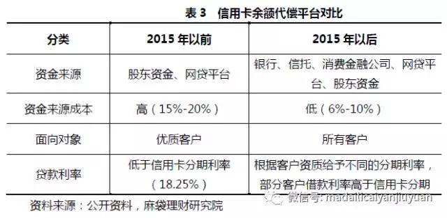 传统金融机构不仅没有直接参与这个细分领域,而且也没有像今天这样直接给互金平台提供资金,信用卡余额代偿机构只能通过P2P平台融资。而两年前网贷本身并不成熟,投资者(出借人)对产品收益要求较高,加上运营成本,一般超过15%。而信用卡余额代偿业务定位的是相对优质客户,一般给予客户的融资利率低于信用卡分期年利率18%。考虑到坏账、人工费、推广费等,平台获得的息差非常有限,盈利较难。
