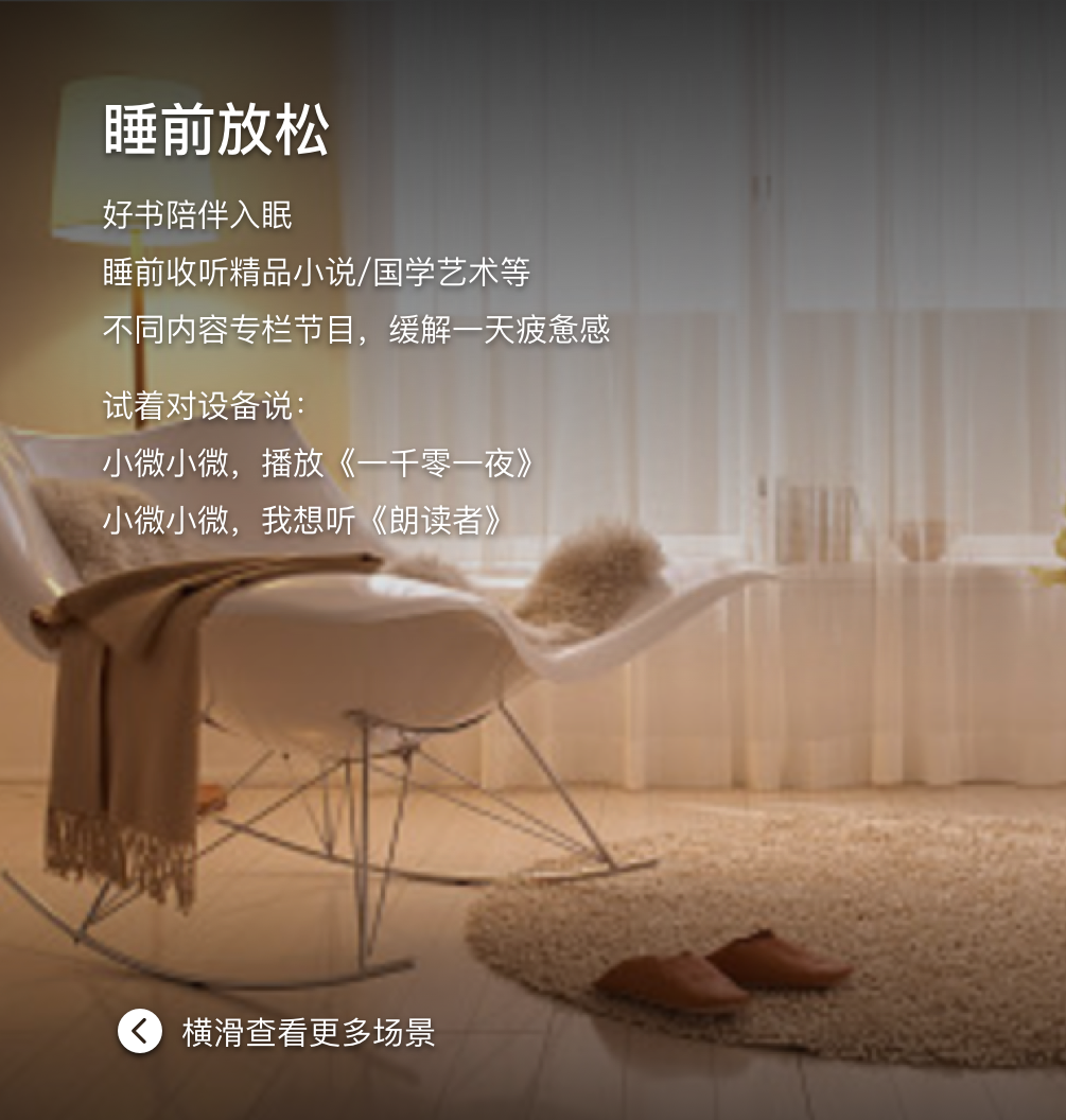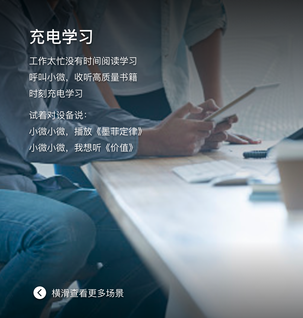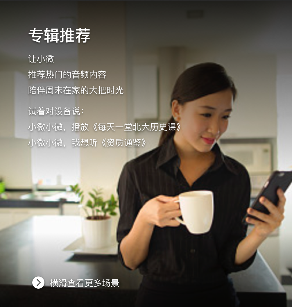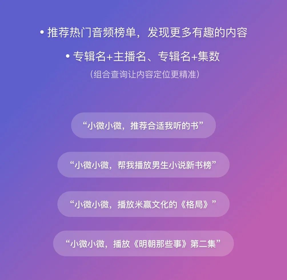 在接入腾讯小微平台的设备中,用户都可以用“小微小微”,让微信听书的内容随叫随到,使用不同的组合查询还可以让内容定位更精准。
