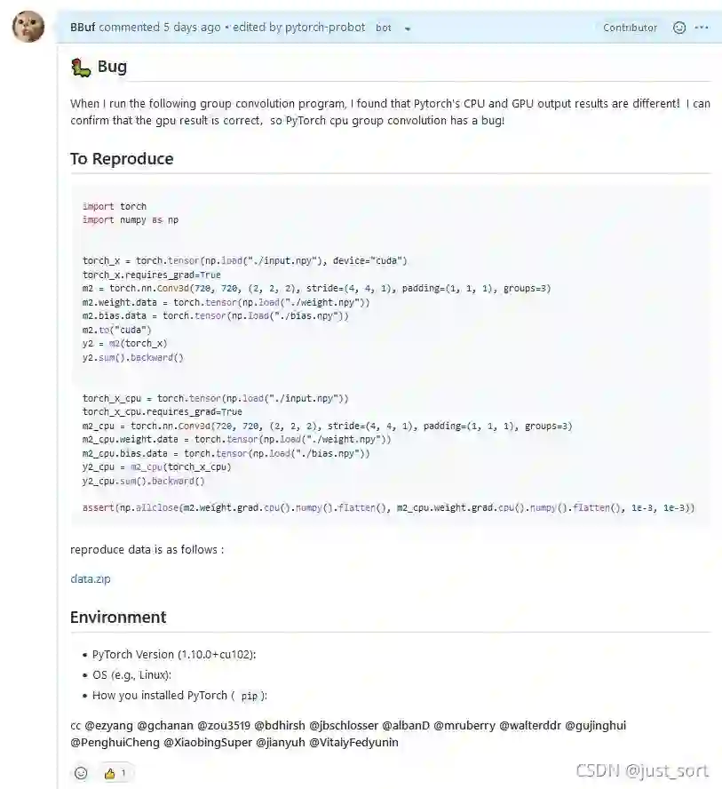 赶紧整理出了复现代码给PyTorch提了issue:https://github.com/pytorch/pytorch/issues/68868 。