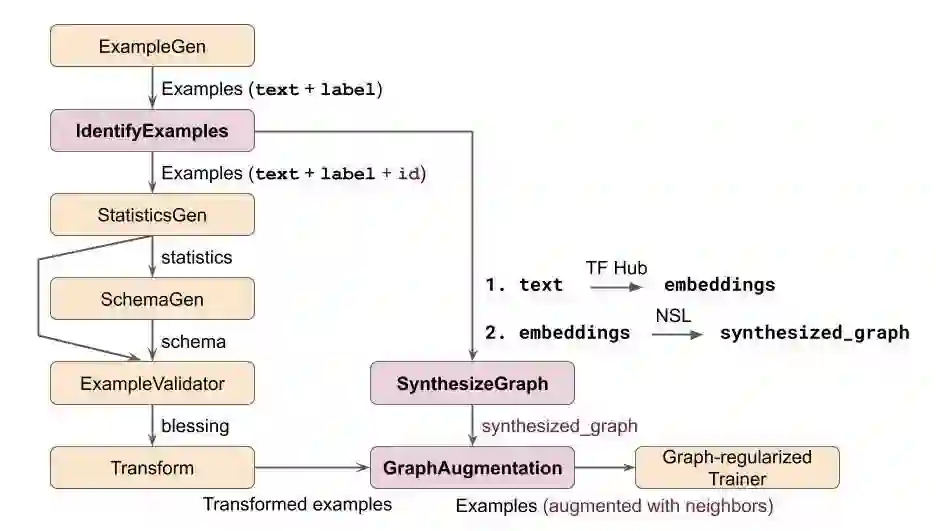 为展示如何使用 NSL,我们构建了一个示例 TFX 流水线,对 IMDB 数据集进行情感分类。我们提供了一个基于 Colab 的教程,演示了如何使用 NSL 与原生 TensorFlow 来完成这项任务,我们以此作为示例 TFX 流水线的基础。