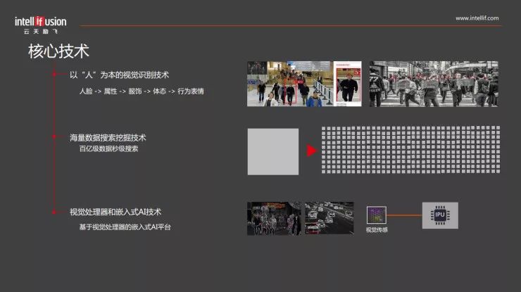 2016年,这套系统参与了杭州G20峰会的安保工作。后来又协助深圳刑警、交警,实现了行人闯红灯抓拍等一系列社会应用。其中最核心的技术无非是人工智能的三大核心要素——算法、芯片、数据。