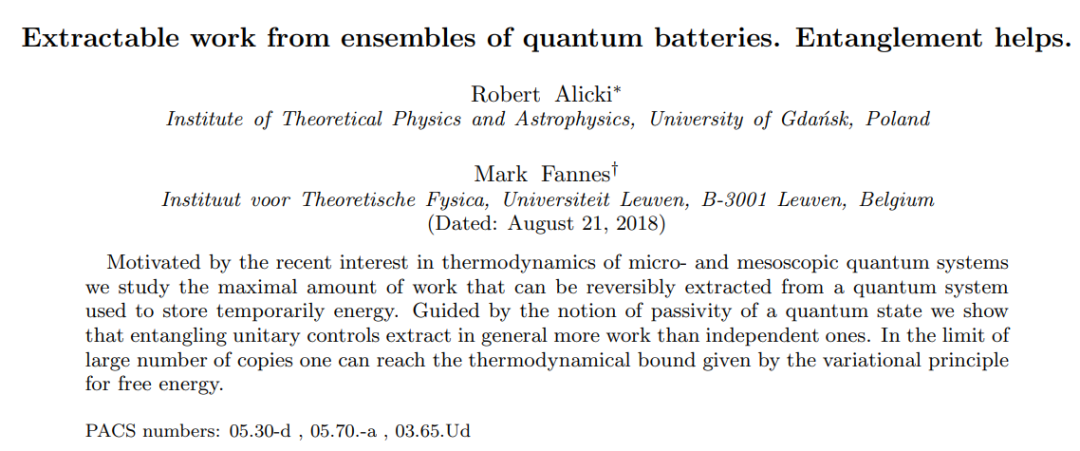量子电池技术最早是 Alicki 和 Fannes 于 2012 年发表的一篇开创性论文中提出的。从理论上说,量子资源(例如纠缠)可以把电池组中的所有单电池当成一个整体来充电(collective charging),大大加快电池组充电过程。